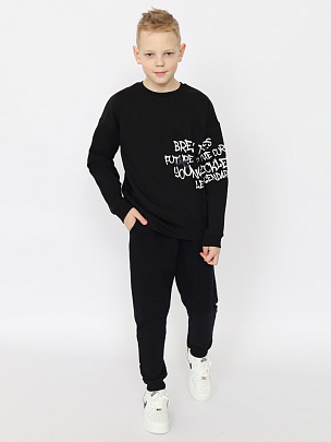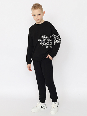 Джемпер с длинными рукавами, притачным поясом и манжетами. Манжеты и пояс выполнены из основного полотна. Горловина круглая с притачным воротником из полотна с добавлением лайкры. Перед и рукав декорированы принтом "Нарушай правила, будущее пренадлежит любознательным, юный и безбашенный, давай будем легендарными".
