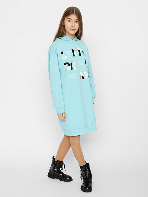 Платье для девочки с длинными рукавами и капюшоном. Рукава с манжетами по низу. Нижние срезы платья обработаны притачным поясом. Пояс и манжеты выполнены из полотна с эластаном. Перед платья декорирован принтом "Давай мечтать".