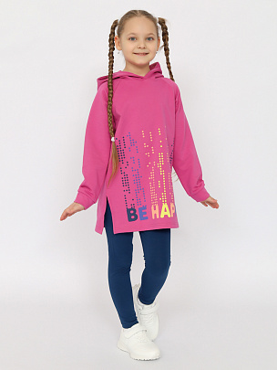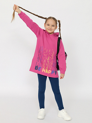 Костюм из худи и легинсов для девочки. Худи с капюшоном свободного силуэта, манжеты из основного полотна, которые надежно облегают запястье ребенка. Спереди декорировано принтом с надписью - "Будь счастлив". Мягкие и комфортные легинсы для девочки на каждый день. Отличный вариант для прогулок и активного отдыха, в поездках незаменим.