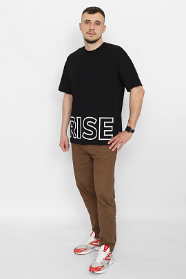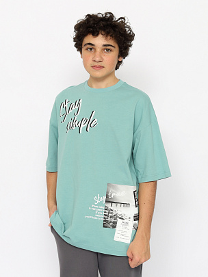 Объемная футболка оверсайз из кулирки повышенной плотности длиной до бедер. Рукав до локтя. Круглая горловина обработана узкой притачной обтачкой из рибаны с эластаном. Горловина декорирована принтом "возврата нет".