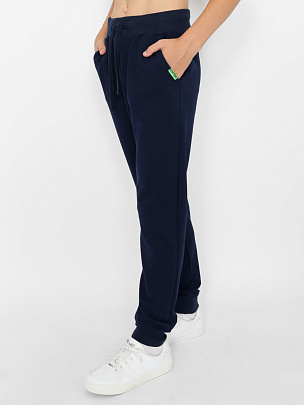 Брюки с карманами и притачным поясом из полотна с добавлением лайкры, в пояс вставлен функциональный шнур. Нижние срезы брюк обработаны притачными манжетами из полотна с эластаном. Карман брюк декорирован вязаной нашивкой.