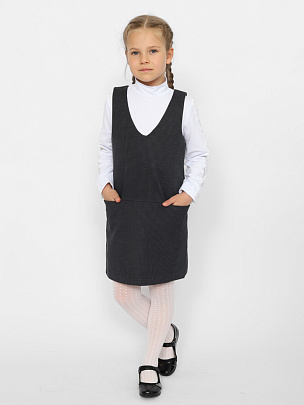 Сарафан для девочки выполнен из набивного футера - имитирует костюмную ткань. Школьный сарафан на широких бретелях без лишних застежек и замков имеет удобный А-силуэт. Добавление в состав эластана обеспечивает идеальную посадку и полную свободу движений. Спереди сарафана расположены прорезные карманы в шве. Сарафан удобно надевать поверх блузки, водолазки, джемпера или футболки, он будет актуален на протяжении всего учебного года.