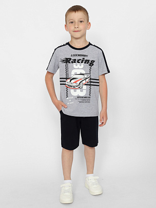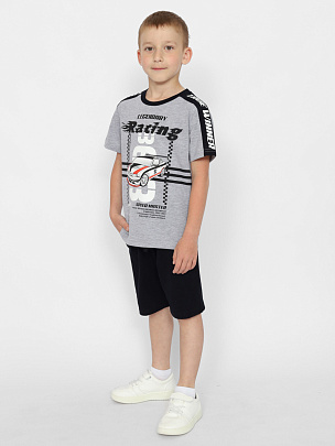 Футболка для мальчика с контрастными вставками по плечам и рукавам. Вставки декорированы принтом. Горловина круглая, обработана узким воротником из полотна с эластаном. Перед футболки декорирован принтом "гонки".