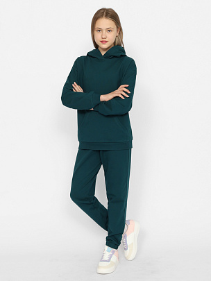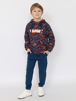 Толстовка с длинными рукавами и притачным поясом по низу. Манжеты и пояс выполнены из полотна с добавлением эластана. Перед с отрезной вставкой контрастноко цвета, которая переходит в воротник "Стойка". В нижней части переда расположен карман-кенгуру с декоративным принтом. Вставка переда декорирована принтом "ИДИ ВПЕРЕД. Брюки с притачным поясом и манжетами. В пояс вставлена резинка и функциональный шнур. Пояс и манжеты выполнены из полотна с эластаном.