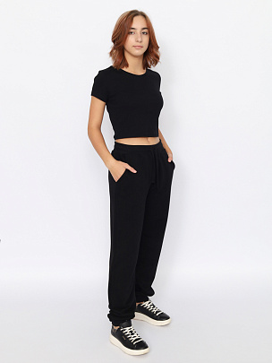 Свободные трикотажные брюки с карманами. В притачной пояс вставлена резинка и функциональный шнур. Нижние срезы брюк оформлены манжетами.