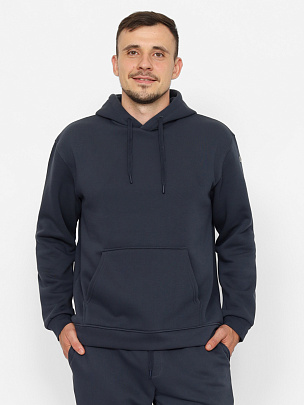 Толстовка мужская с капюшоном со шнурком, карман-кенгуру. Манжеты и пояс из эластичной рибаны. На рукаве декоративная силиконовая нашивка.